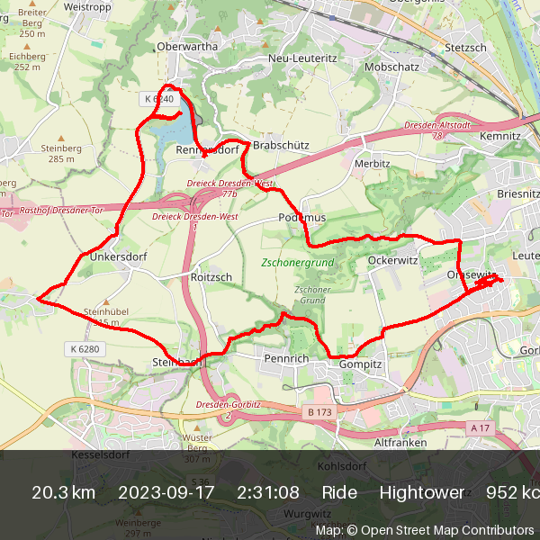 | 2023-09-07 17:52 | 22.6 | 1:23:29 | Hightower | Ride |